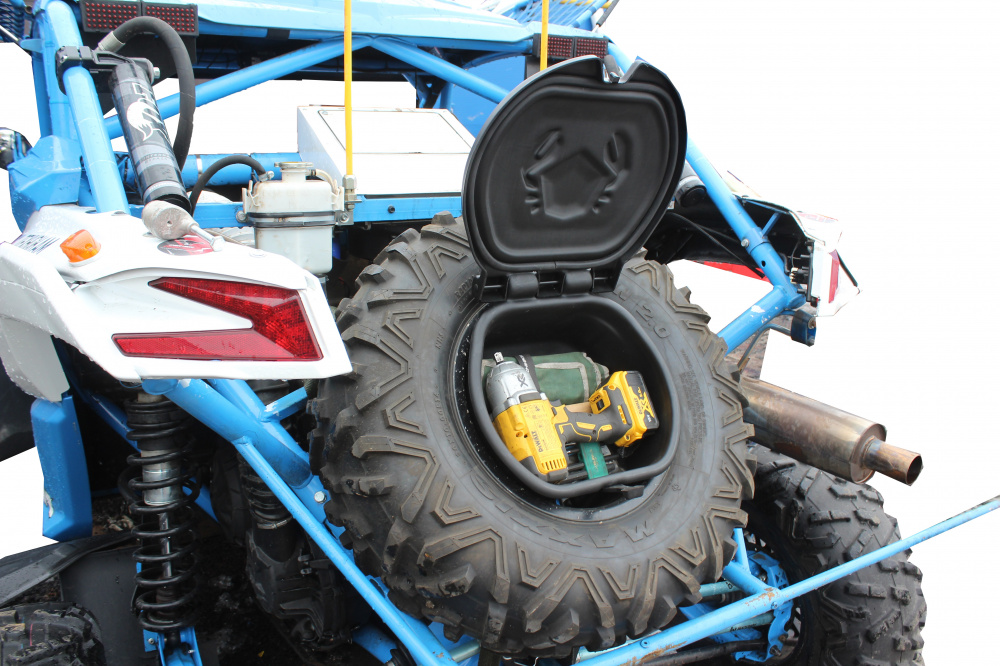 Кофр инструментальный в запасное колесо будет интересен спортсменам и не только. В ящик Вы можете положить весь инструмент (гайковёрт, набор ключей и другие вещи, которые могут Вам пригодиться). Доступ к ящику можно получить оперативно сняв колесо со стяжки. Изготовлен из ударопрочного пластика. Имеется уплотнитель, исключающий попадание влаги внутрь. На крышке установлена резиновая защёлка.