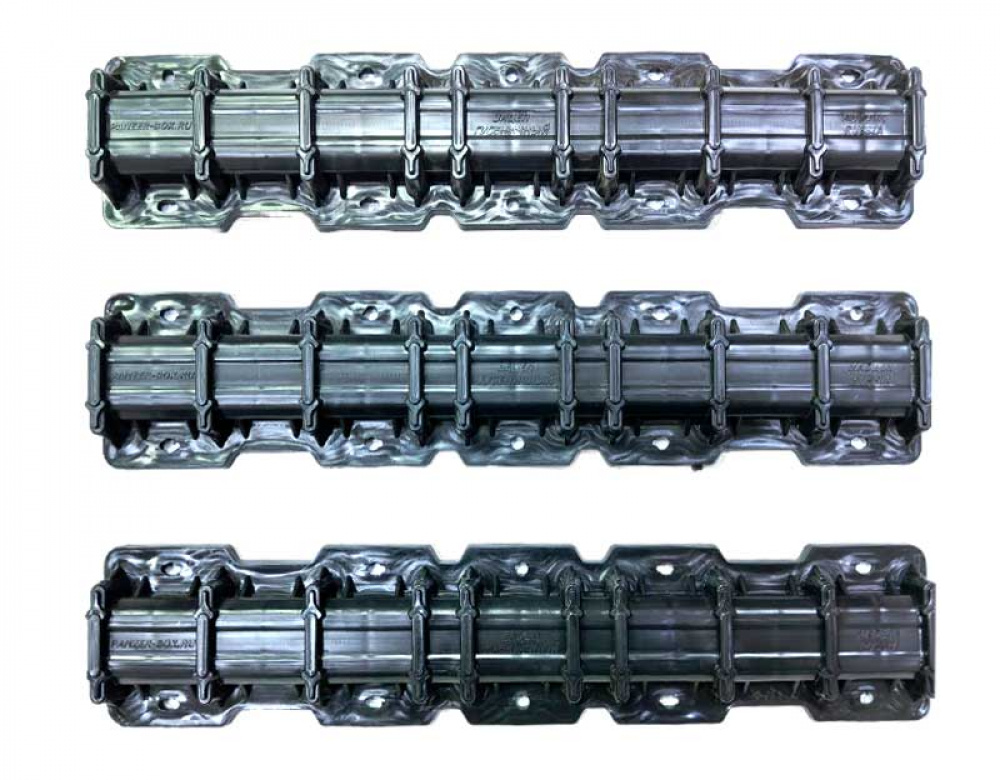 Зацеп изготовлен из ударопрочного морозостойкого полиэтилена низкого давления. Температура эксплуатации до -50°С. Способствуют надежной фиксации гусеницы во время транспортировки.